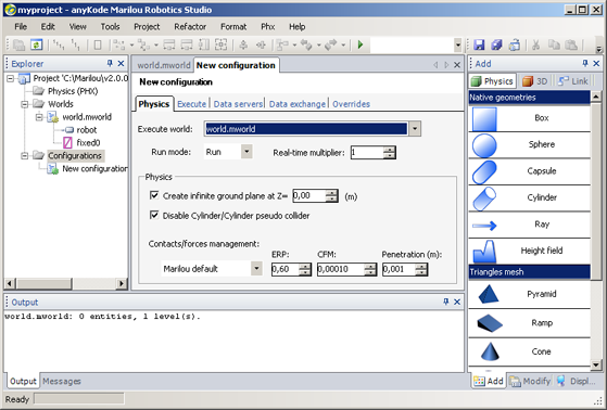 In the New Project dialog-box, choose basic project. The wizard will create a project with a world file (.mworld file) and a default configuration. |
